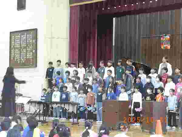 10月30日(金)校内音楽会を行いました。1・2年生は、大きく口を開けて元気に歌い、鍵盤ハーモニカや打楽器を使って一生懸命演奏をしていました。3・4年生は、リコーダーのきれいな音色を響かせて演奏し、表情豊かに合唱をしていました。5・6年生は、迫力のある演奏とともに、みんなの心を一つにし、言葉一つひとつを大切にした素晴らしい歌を聞かせてくれました。にじいろ学級と音楽クラブは、一人ひとりがしっかりと音を響かせて、大人数にも負けない演奏を披露しました。明日11月1日(土)は、音楽発表会(学校公開)を行います。