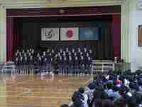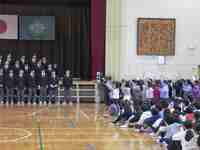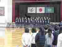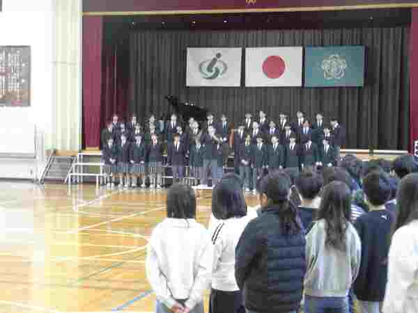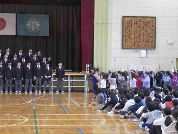 春野中学校の2年生が来校し、小中学校合同の音楽朝会を行いました。中学生の迫力のある素晴らしい合唱を聴くことができ、春野小の子どもたちは感動していました。春野小の1年生のかわいい発表の後、最後は中学生と小学生みんなで声を合わせ、体育館いっぱいにきれいな歌声を響かせました。